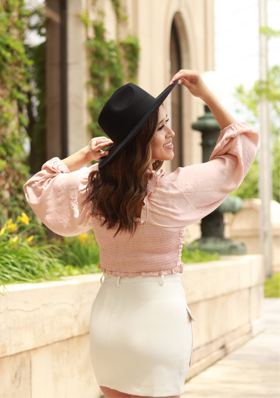 Every trendy babe needs a ruched blouse in their closet! Our Georgia Peach Ruched Crop Blouse is a light peach color. This piece has long billowy sleeves and an adjustable front drawstring. Styled with the Classic Mini and Riding Country Hat!