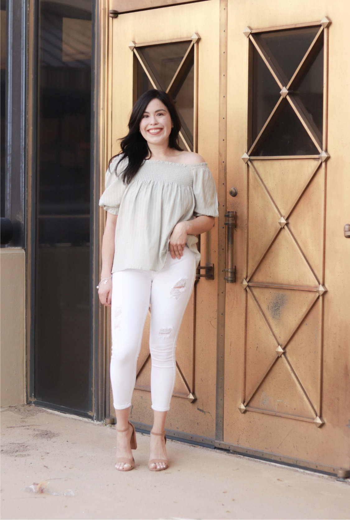 We are in love with adorable mint jacquard stripe off the shoulder blouse! It's a must have in your closet this season and will make a great summertime piece. This blouse features a trendy lightweight fabric and breezy flowing style. Pair this beautiful top with a shorts and sandals!