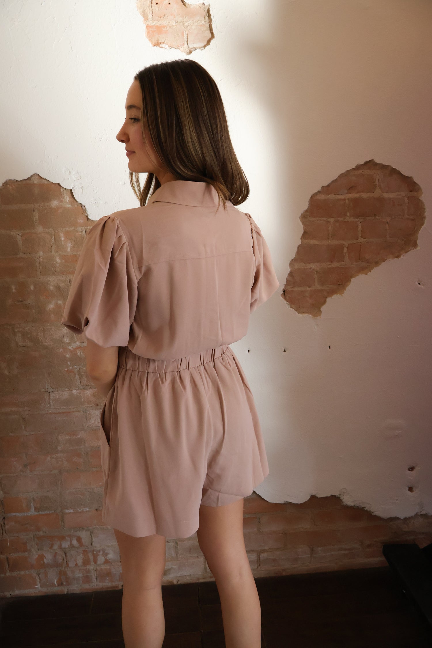 This cute romper is the perfect combination of style and comfort. With its solid color and flattering drawstring waistband, it offers a customizable fit that cinches at the waist for a feminine silhouette. The collared neckline and button-down front add a touch of sophistication, while the puff sleeves bring a playful, on-trend vibe. The model is wearing a size small, and it's made from 100% polyester, ensuring a soft and breathable feel. This shorts romper is ideal for casual outings or dressed up for a chic day look.